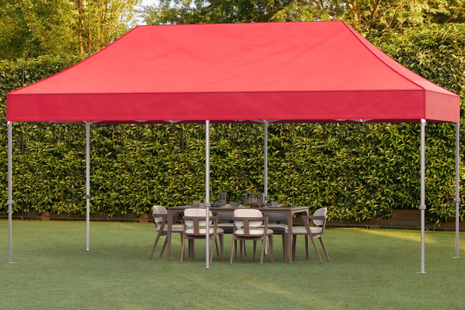 Deze Easy up partytent van 3 bij 6 meter heeft een vloeroppervlakte van 18 m² en is uitgevoerd in de best mogelijke kwaliteit. Een dikwandig aluminium harmonica buizenframe met aluminium verbindingen. De staanders zijn uitgevoerd in gewalst hexagon profiel en hebben een buitenmantel diameter van maar liefst 50mm zodat deze uiterst sterk zijn. Met een grote voetplaat eronder staat deze tent stevig op zijn plaats. Het systeem wordt door middel van het schaarmechanisme uit elkaar getrokken en met gemakkelijke en veilige kliksystemen vastgezet. De koppelingen en scharen zijn allen vastgezet met hoogwaardige RVS bouten en borgmoeren. Het dakzeil blijft op spanning staan door de hoogwaardige stalen veer tussen om de steunpalen. De dakondersteuning is voorzien van plastic kap die in het extra verstevigde deel van het dakzeil valt zodat het tegen een stootje kan.