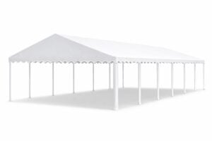 Het dakzeil van deze tent is van hoogwaardige kwaliteit en biedt verschillende voordelen. Het is brandvertragend gelabeld en vervaardigd uit 550 gram per m² PVC, wat zorgt voor een stevige en duurzame constructie. Daarnaast zijn er tochtflappen met klittenband bij elke staander voor extra bescherming, en metalen oogringen voor de bevestiging van elastieken. De naden zijn geseald in plaats van gestikt, wat de sterkte aanzienlijk vergroot. Het zeil is volledig UV-bestendig en 100% waterdicht, waardoor het uitermate geschikt is voor langdurig gebruik onder diverse weersomstandigheden.