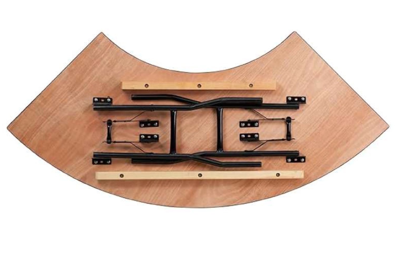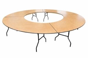 Deze set van 4 kwartronde klaptafels vormt samen één grote ronde tafel met een buitendiameter van 305 cm. In het midden ontstaat een ronde opening met een diameter van 152 cm, ideaal voor decoratie, bloemstukken, een boom of buffetpresentatie.
